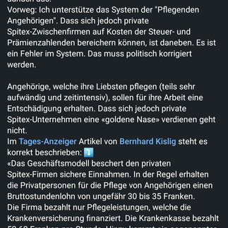 Ebenso bedeutsam ist es, Organisationen zu überwachen und einzuschränken, die diese Situation ausnutzen und dadurch mehr Profit erwirtschaften als die Betroffenen selbst. Dies betrifft nicht nur private Spitex-Organisationen, sondern auch private Alters- und Pflegeheime, die von Investoren aufgekauft wurden, um Gewinne zu erzielen.